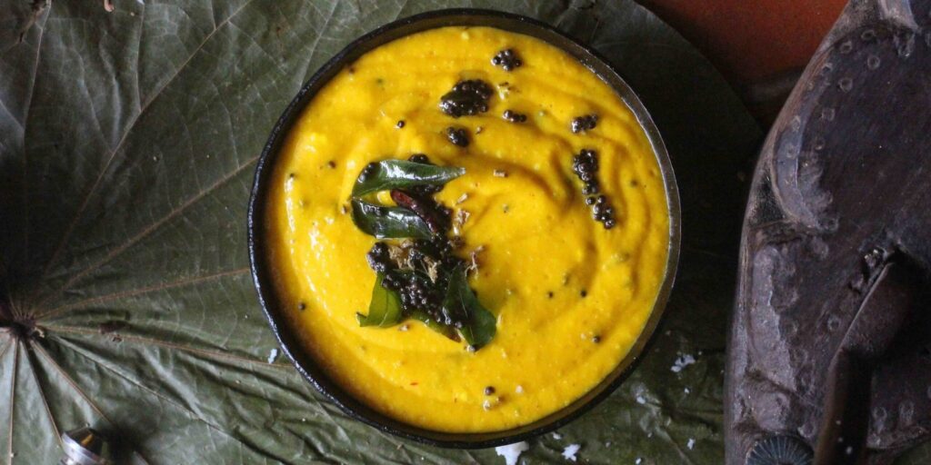 Choose good quality mangoes-they should be ripe, flavorful, and sweet. This dish relies heavily on the mango taste, so the better the mango, the better the pulisseri. Home » Blog » Mambazha Morkootan or Pulissery Mambazha Morkootan or Pulissery July 2025 · Deepa Reddy Ingredients 2 large and very ripe mangoes ½ coconut grated 1 cup of thick yogurt ¼ teaspoon turmeric powder Salt, to taste A little jaggery to balance the sourness of the mango, if necessary To roast 1 teaspoon raw rice ½ teaspoon fenugreek or methi seeds 1 red chilli (or 1 whole green chilli-add that to the ingredients to grind) To temper 1 tablespoon coconut oil 1 broken red chilli ½ teaspoon mustard seeds ½ teaspoon urad dal ½ teaspoon jeera or cumin seeds A pinch of hing A sprig of curry leaves paticheri_Mangopulisseri Method Choose good quality mangoes-they should be ripe, flavorful, and sweet. This dish relies heavily on the mango taste, so the better the mango, the better the pulisseri. [If your mangoes are on the raw-side-of-ripe, follow the cooked pulisseri method linked below] Peel and chop the flesh or extract pulp by hand. Set aside. Dry roast the rice, methi and red chilli (if you’re using the green, add it to the blended ingredients in the third step). Once the rice turns opaque, transfer to the jar of a blender and pulverise to a powder. Now add the green chilli and mango pieces/pulp to the rice-methi powder; pulse to combine. Add the coconut and pulse again. Add the turmeric, salt, and jaggery to taste, followed by the yogurt. You want the sweet of the mango to stand out, but with hints of chilli, the flavor of methi, and the tang of curd enhanced by salt. Transfer to a serving dish. To temper Heat the oil in a small tempering pan to almost smoking point, and then add the spices in quick succession: red chilli, mustard, urad dal, jeera, hing, curry leaves. Once the curry leaves are crisp, pour this over the pulisseri. Serve at room temperature or refrigerate and serve cold – but always with warm sevai or hot rice. Previous ArticleNext Article Featured Articles Monthly Updatesㅤㅤㅤㅤㅤㅤㅤㅤ 19 Sep 2025 Abundance Product of the Month 18 Sep 2025 Recipe Alert – Stir Fried Sweet Potato leaves with Tofu 22 Sep 2025 Food and Agriculture in Auroville, India 18 Sep 2025