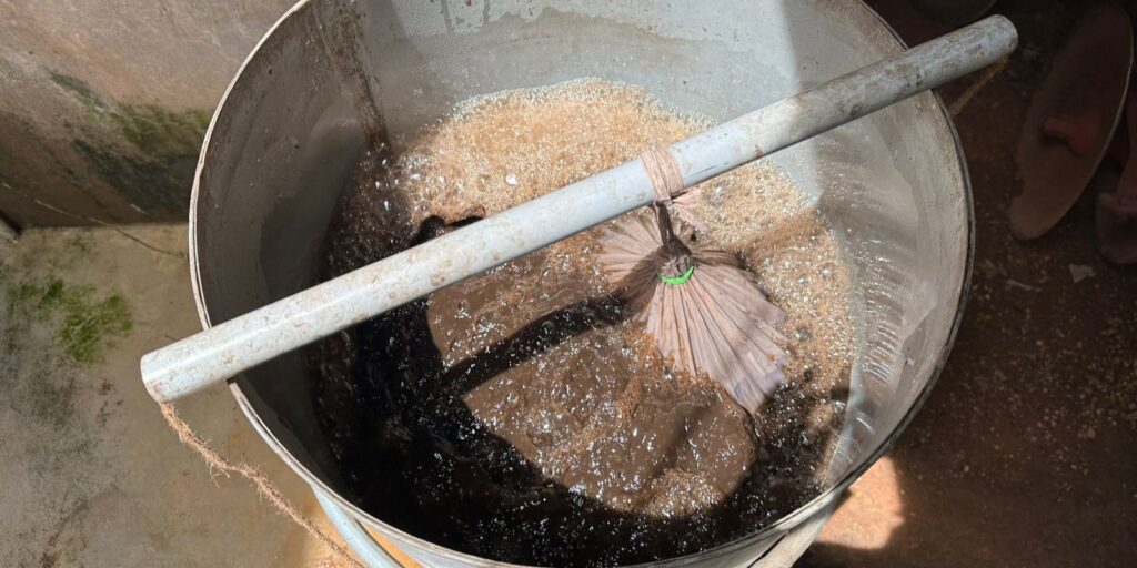 As Dr. Elaine Ingham said, “there is no soil on this planet lacking nutrients to grow plants”, in other words there is intrinsically food (organic matter) in the soil, that we actually just enrich with mulch and compost in farming, according to the needs of our crops. However, sometimes there is not enough microbes to eat that food and release nutrients for the plants. Excess of food can turn into excessive oxidation and there is no conversion back to nutrients. Then compost becomes interesting because it contains a diverse amount of beneficial microbial population which contributes to the decomposition of the organic matter. In that sense spreading solid mature compost can be a solution, but it can be hard to do on a large cultivated area (heavy physical efforts, time consuming process). Turn it into a liquid form seems to be an easier way to do it on an agricultural scale. Dr. Elaine Ingham is the one who helped create the modern version of it : a compost tea using aerobic reaction. Home » Blog » COMPOST TEA: A Natural Probiotic for Soil and Plants COMPOST TEA: A Natural Probiotic for Soil and Plants July 2025 · Lucile As Dr. Elaine Ingham said, “there is no soil on this planet lacking nutrients to grow plants”, in other words there is intrinsically food (organic matter) in the soil, that we actually just enrich with mulch and compost in farming, according to the needs of our crops. However, sometimes there is not enough microbes to eat that food and release nutrients for the plants. Excess of food can turn into excessive oxidation and there is no conversion back to nutrients. Then compost becomes interesting because it contains a diverse amount of beneficial microbial population which contributes to the decomposition of the organic matter. In that sense spreading solid mature compost can be a solution, but it can be hard to do on a large cultivated area (heavy physical efforts, time consuming process). Turn it into a liquid form seems to be an easier way to do it on an agricultural scale. Dr. Elaine Ingham is the one who helped create the modern version of it : a compost tea using aerobic reaction. Compost tea is an organic liquid fertilizer made by brewing mature compost in water with the aim to extract and multiply the beneficial microorganisms present in this compost, through aerobic processes, and introduce it to either directly to the roots or plants to rebalance and enrich the microbiome life. Using compost tea is a permaculture practice that respects the life in the soil, understands how important it is, helps it grow without harming it while still allowing farming to continue. The main intention is important : to make all systems more efficient, in other words an healthy system which works on its own and not with the aim of exploiting the soil. Compost tea can be poured to the roots of the plant to enrich microbial life of the soil as we just explained or it can be applied as a foliar spray by sprinkling it on the leaves to strengthen and protect them. More precisely, compost tea protects the pores on the leaves (called stomata). Because they are open areas, bacteria can deposit there. In general, good bacteria in the compost tea can live on the stomata protecting them from bad bacteria. To make compost tea we first need to start with good cultured mature compost (6 month to 1 year in age). Mature compost means material that only grows beneficial organisms. It is important because we must be sure that nasty elements like pathogens and parasites in the compost have been killed by the composting process, which requires high enough temperature for a long enough time. As a reminder, compost should be made of green and wood materials that help bacteria and fungi grow, and their growth causes the temperature to rise in the compost pile. Of course compost must be made based on what our soil needs. If we need more bacteria, we add more green materials. If we need more fungi, we add wood materials. It depends on what the soil is missing and what biology we want to bring back. Then, to permit our starting culture to grow we need a specific favorable environment who provides space, medium, food and a process to make our compost tea : it’s our machine. In this machine we have : Contents : The tea tank : who should be round shape, with no sharp corners to helps water and air move freely, avoid collect and bacteria from growing and be easy to clean. A tea bag : used to hold the compost during brewing, who will be able to block solid particles and allows microorganisms to pass through. Perfect mesh size is 400-800 microns. The bag should be placed where water and air can flow through it easily and be partially filled to do not block water flow. The medium : Water to extract the beneficial organisms off the solid surface of compost. Water have to be free of chlorine and chloramine which might effect the organisms in the compost extract. For that purpose we use humic acid which is adequate to kill any toxic chemicals that are present in the water. Humic acid also causes the dark brown color in the compost. By chlorine, chloramine, sulfates it decolonizes the humic acid so it is therefore its easier to notice their presence and adapt the concentration of humic acid. Water we brew have to be at room temperature so that the microbial growth is flourishing. The food : The type of food we add to compost tea will influence which kinds of microorganisms grow. It all depends on what we want to achieve. If we want to develop bacteria, we use foods that promote fast bacterial growth. If we want to grow fungi, we need to feed the fungi directly with more complex foods. Here are some good options : Jaggery (unrefined sugar) who helps develop bacteria, promoting rapid microbial growth during brewing.