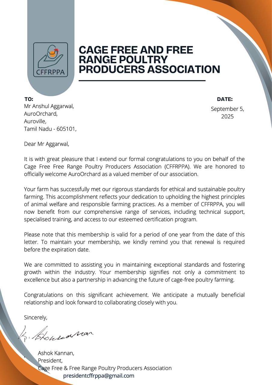 In September 2025, AuroOrchard was formally recognised by the Cage Free & Free Range Poultry Producers Association (CFFRPPA) for meeting its rigorous standards of ethical and sustainable poultry farming. This membership affirms our commitment to uphold the highest principles of animal welfare and ecological responsibility while continuing to learn and evolve.