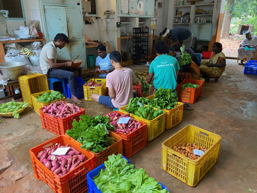 Working at AuroOrchard has been one of the most grounding experiences of my time in Auroville. My favourite part of the farm work was weeding 🙂 – it felt so satisfying to make space for the vegetable plants (which somehow made space in my mind, too), and it kept me close to the soil where I could observe all the little creatures that went about their day. I also loved setting up the space under the tree for breakfast – flowers being the primary décor.I made a few solid friendships there, too. I found that working alongside another volunteer with a common sense of purpose, helped me develop meaningful bonds more organically than meeting at a café for chai. There is something deeply fulfilling about watching simple, honest efforts grow into real and nourishing results. It reminded me how such modest work can bring so much peace.