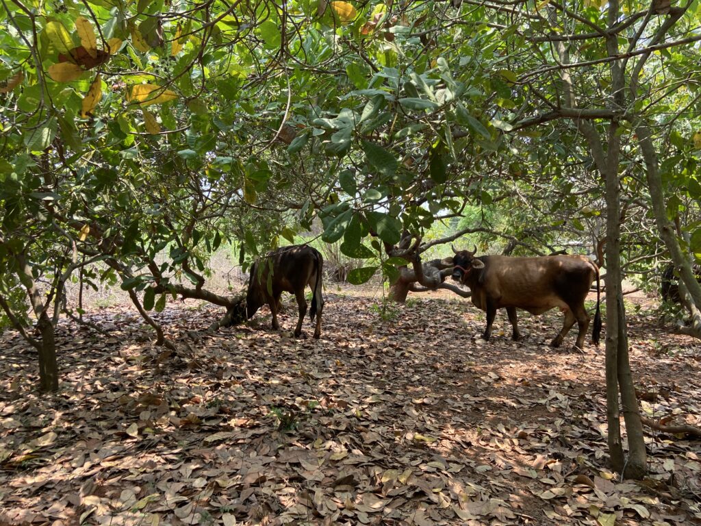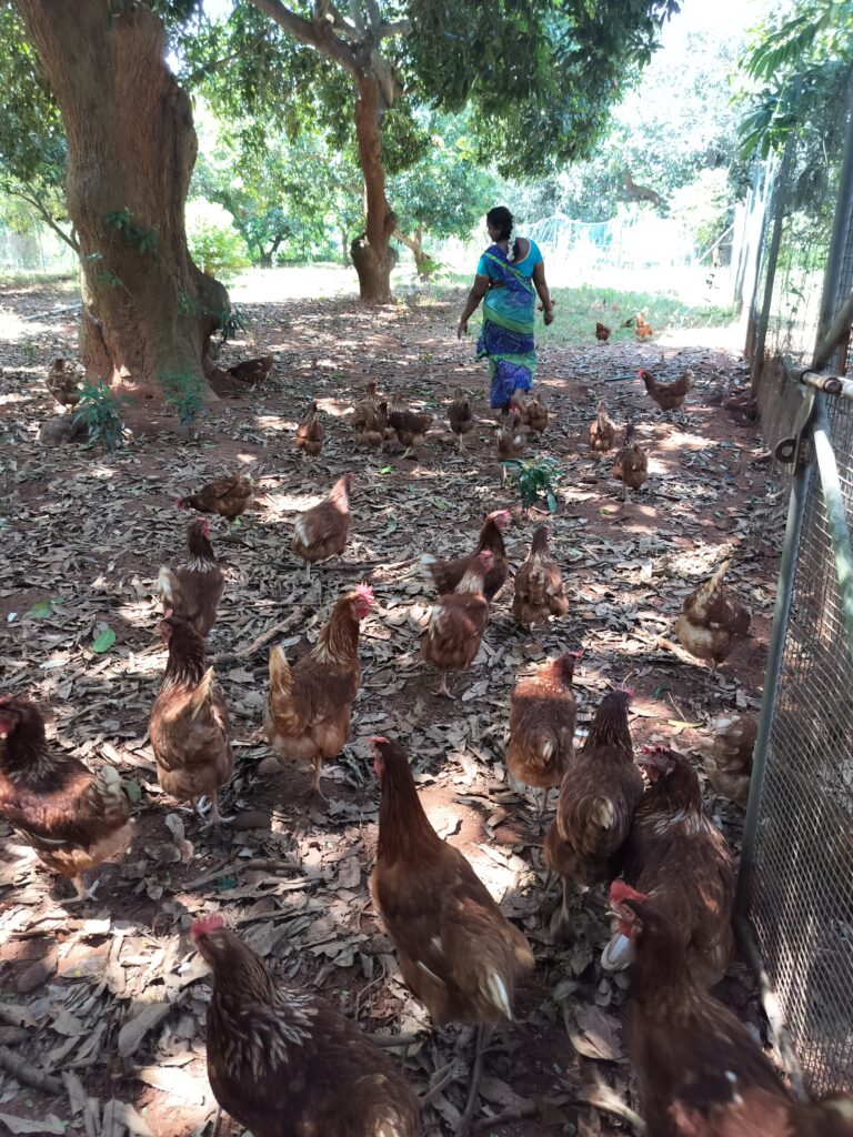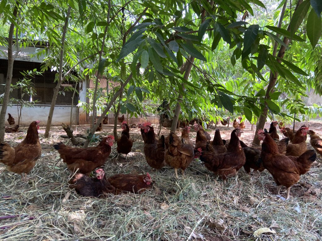 At AuroOrchard, we are grappling with the same questions–with our cows and chickens. While the cows graze in the orchards and give us their dung and urine to fertilise our fields, they are financially supported through a fund. For the chickens, who produce an abundance of eggs for the community, we strive to give them the best life possible on the farm, and continue to explore what better we can do to create natural conditions for life, as much as possible. We do have to sell these chickens after about two years. Once they are sold, they are butchered and become food. Is this ideal? Certainly not. And this is the dilemma of every farmer who is tasked with the responsibility of feeding the community. In our experience, the way forward may be in discovering a renewed relationship of interdependence, a new language of mutuality which does not treat animals as units of production, but where there is a greater acknowledgement and gratitude for the sacrifice of the bodies of the farmer, the animals and the land in feeding the world towards greater consciousness.